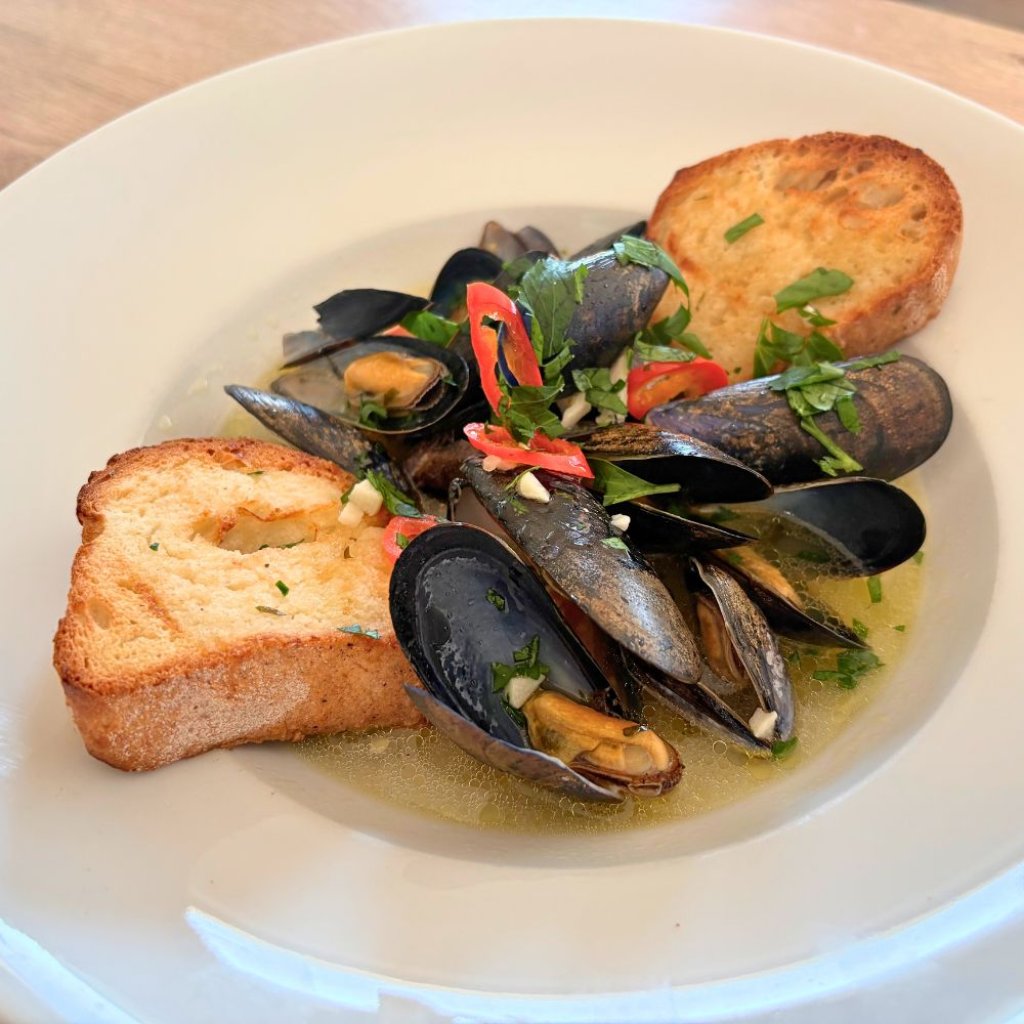 Slávky, česnek, bílé víno, petrželka, opečený domácí chléb, feferonky | Mussels, garlic, white wine, parsley, toasted bread, hot peppers