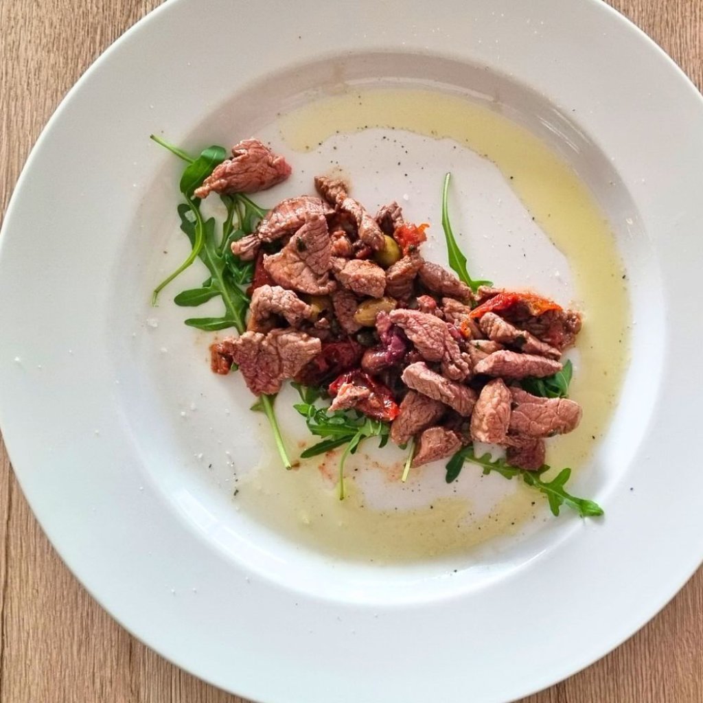 Hovězí nudličky, olivy Taggiasche, kapary, sušená rajčata, bílé víno, rukola, česnek, petržel | Beef strips, Taggiasche olives, capers, dry tomatoes, white wine, rocket salad, garlic, parsley