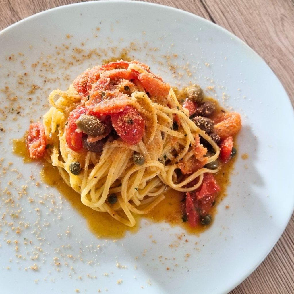 Ančovičky, olivy, kapary, cherry rajčata, čerstvé chilli, strouhanka s ančovičkami, petrželka | Anchovies, olives, capers, cherry tomatoes, fresh chili, breadcrumbs with anchovies, parsley