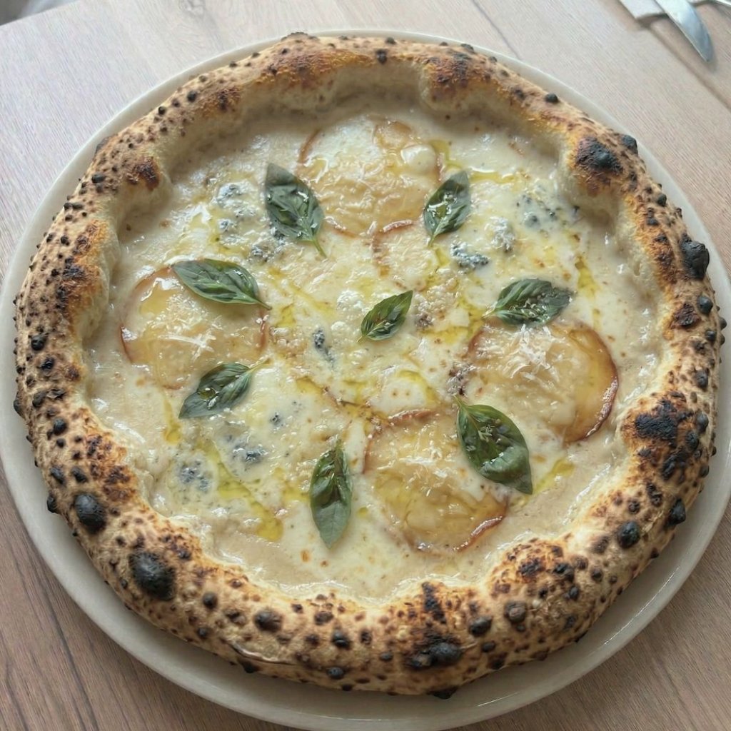 Parmazánový krém, gorgonzola, pecorino, parmigiano, uzená provola, bazalka, extra virgin olivový olej | Parmesan cream, gorgonzola, pecorino, parmigiano, smoked provola, basil, extra virgin olive oil
