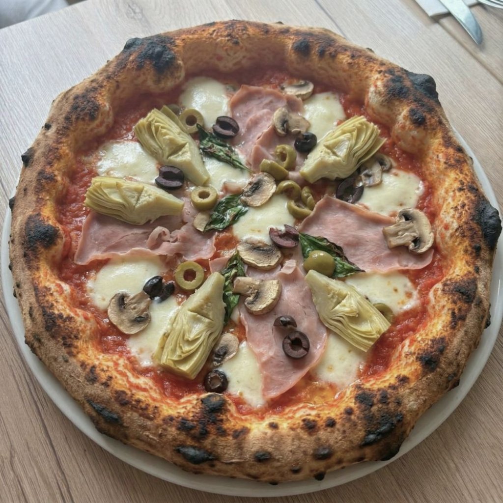 Rajčata San Marzano, mozzarella Fior di Latte, dušená šunka, olivy, žampiony, artyčoky, čerstvá bazalka, extra virgin olivový olej | San Marzano tomatoes, mozzarella Fior di Latte, cooked ham, olives, mushrooms, artichokes, fresh basil, extra virgin olive oil