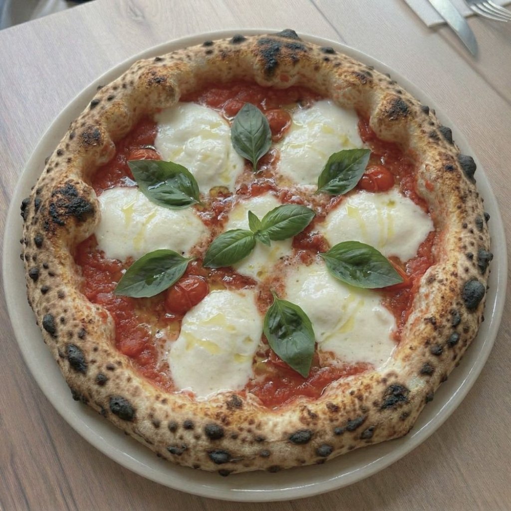 Rajčata San Marzano, mozzarella Fior di Latte, bazalka, extra virgin olivový olej | San Marzano tomatoes, buffalo mozzarella Fior di Latte, basil, extra virgin olive oil