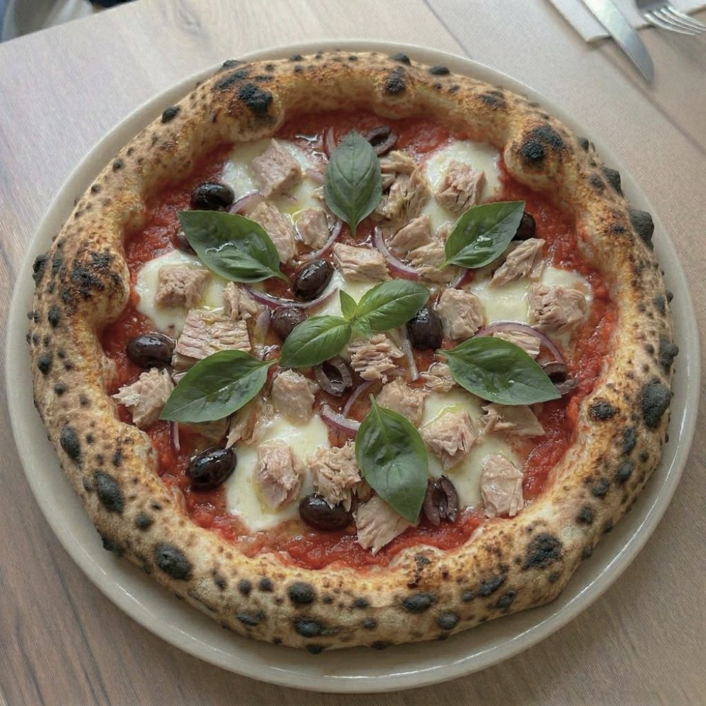 Rajčata San Marzano, mozzarella Fior di Latte, tuňák, červená cibule, olivy, bazalka, extra virgin olivový olej | San Marzano tomatoes, mozzarella Fior di Latte, tuna, red onions, olives, basil, extra virgin olive oil