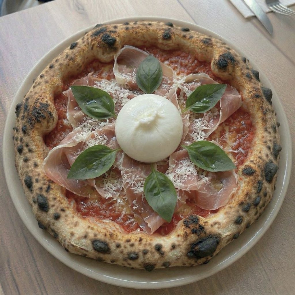 Rajčata San Marzano, burrata, parmazán, parmská šunka, bazalka, extra virgin olivový olej | San Marzano tomatoes, burrata, parmesan, Parma ham, basil, extra virgin olive oil