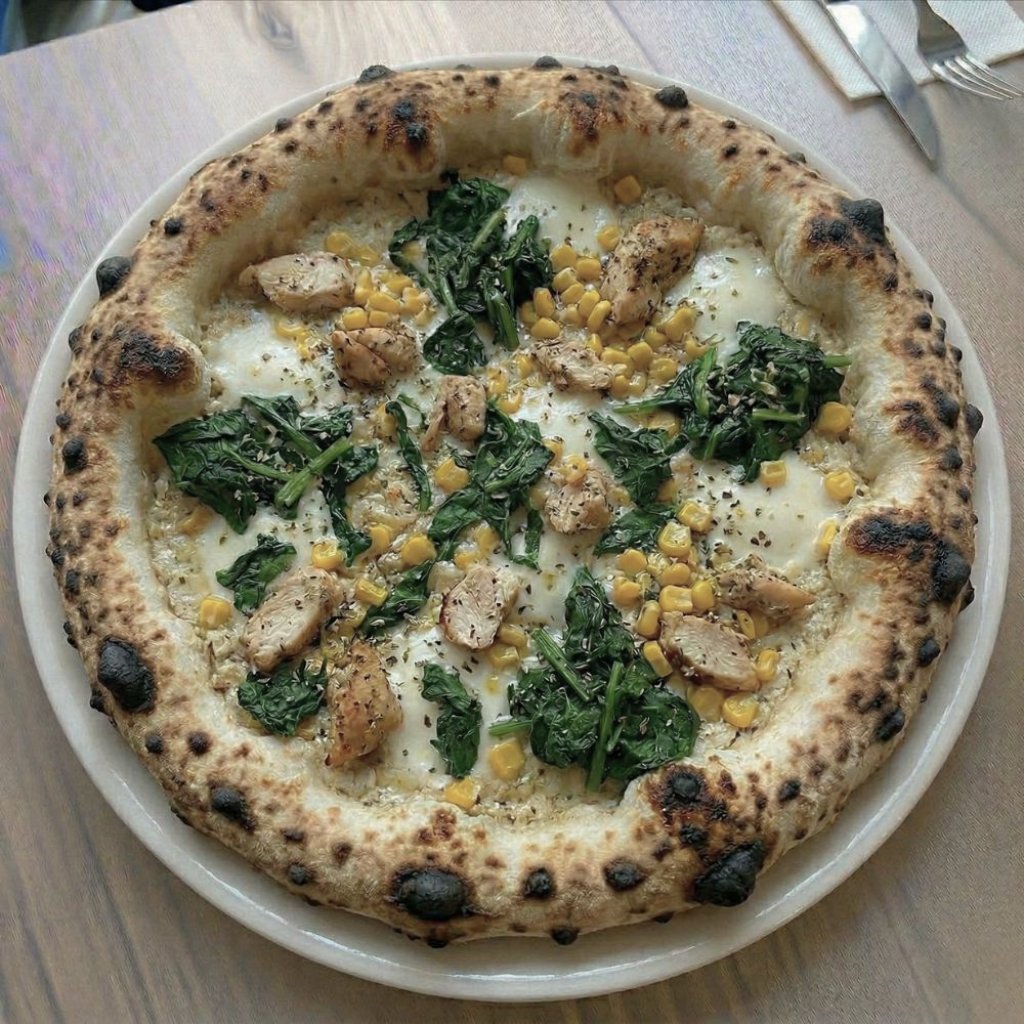 Parmazánový krém, mozzarella Fior di Latte, kuřecí maso, kukuřice, špenát, oregáno | Parmesan cream, Fior di Latte mozzarella, chicken, corn, spinach, oregano
