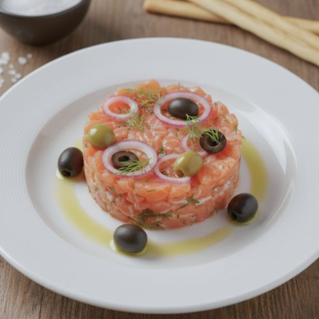 Tatarák z čerstvého lososa, olivy, červená cibule, olivový olej, kopr Salmone tartar, red onion, olive oil, olive, dill