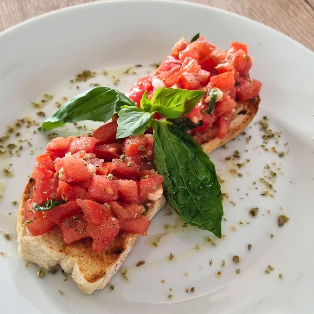 Opečený domácí chléb, rajčata, česnek, bazalka, olivový olej, oregáno | Toasted homemade bread, tomatoes, garlic, basil, olive oil, oregano