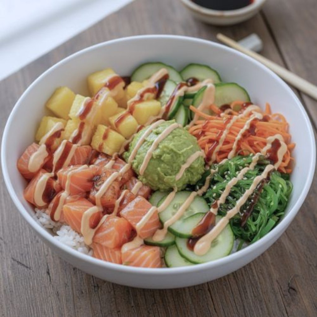 sushi rýže, marinovaný losos, ananas, wakame, okurka, mrkev, guacamole, sojová omáčka, pikantní majonéza sushi rice, marinated salmon, pineapple, guacamole, wakame, cucumber, carrot, soy sauce, spicy mayonnaise