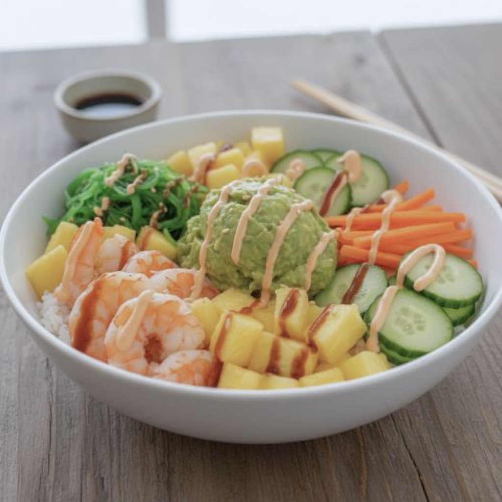 sushi rýže, marinované krevety, ananas, wakame, guacamole, okurka, mrkev, sojová omáčka, pikantní majonéza sushi rice, marinated shrimps, pineapple, wakame, guacamole, cucumber, carrot, soy sauce, spicy mayonnaise