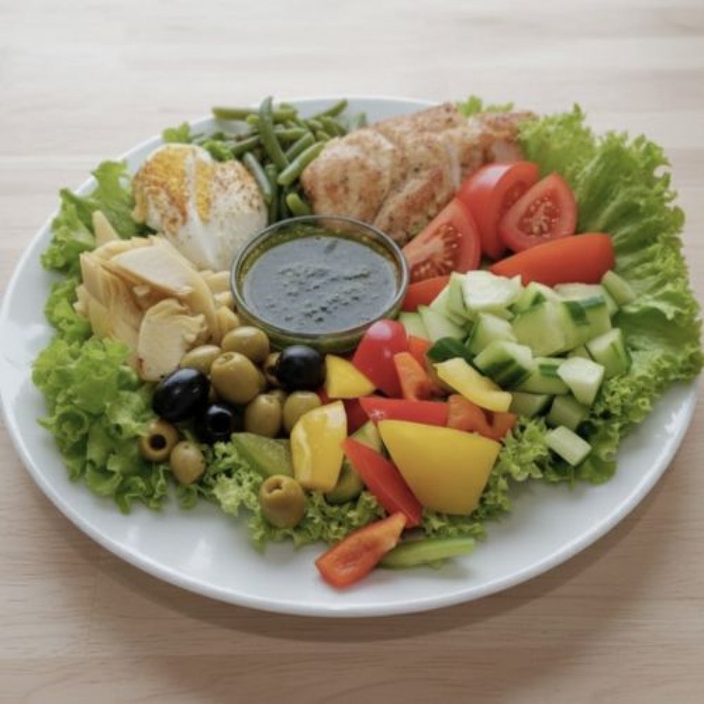 Směs listových salátů, vejce, rajčata, okurky, kuřecí prsa, artyčoky, olivy, papriky, medový dresing, fazolové lusky Lettuce leaves, eggs, tomato, cucumbers, chicken breast, artichockes, olives, green pepers, honey dresing, bean-pods