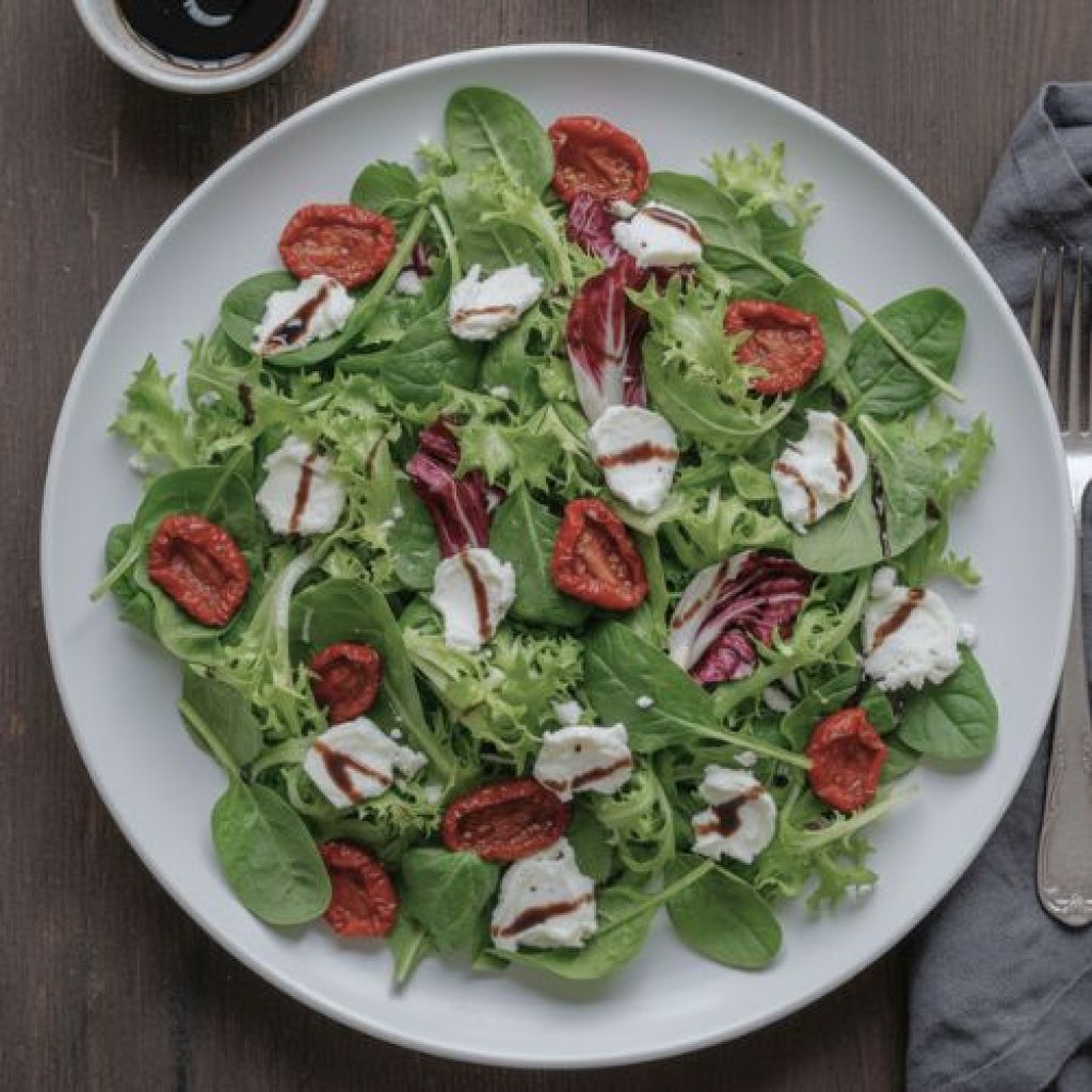 Směs listových salátů, kozí sýr, sušená rajčata, brusinkovo-balsamicový dresing Lettuce leaves with goat cheese, dried tomato, cranberry-balsamico dresing
