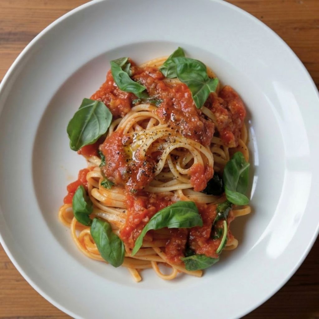 Rajčatová omáčka, cherry rajčata, bazalka, olivový olej | Tomato sauce, cherry tomatoes, basil, olive oil