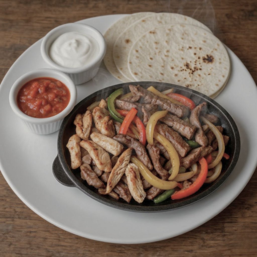Steak na litinové plotýnce s opečenou cibulí a paprikou, 3 tortilly, pikantní salsou, zakysaná smetana, guacamole (sous-vide kuřecí prsa, sous-vide vepřová panenka, brazilská hovězí svíčková) | Steak on a cast iron griddle with roasted onions and peppers, 3 tortillas, salsa, sour cream, guacamole (sous-vide chicken breast, sous-vide pork tenderloin, brazilian beef tenderloin)