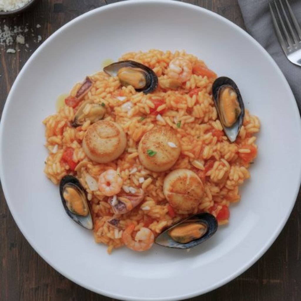 rýže arborio, mořské plody, bílé víno, česnek, rajčata-sugo arborio rice, seafood, wine, garlic, tomato-sugo